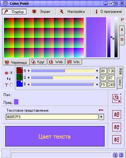 подбор цвета фона и цвета образца текста с помощью нескольких палитр и прямого выставления цветовых компонент моделей RGB и HSV;