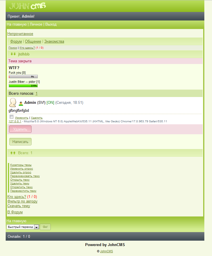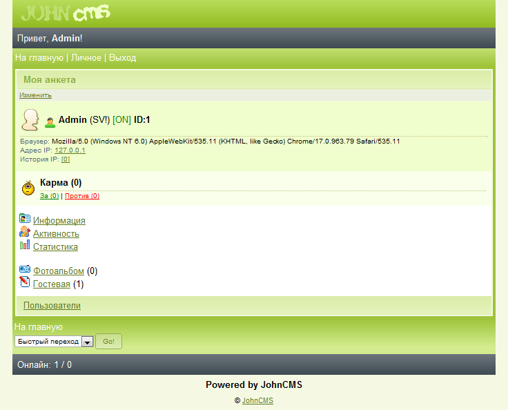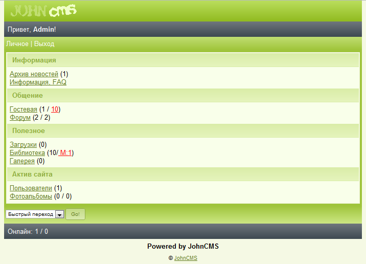Ну собственно вот темка Greendays для JohnCMS 4.х.х(на 3.х.х тоже станет). Тема имеет приятный внешний вид и выполнена в мягких светло-зелёных тонах(скриншоты далее), написал специально в паблик минут за 40. Гг