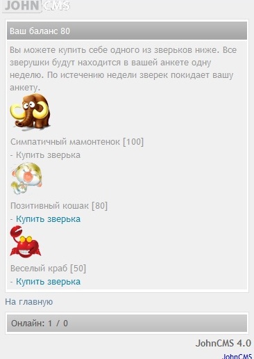 Всем привет вот сегодня написал такую прикольную фишку для 4 джона(позже по 3 сделаю), как прикольные зверьки в анкете каждый пользователь может установить себе в анкету одного из трех зверьков, накопив нужное нужное колличество баллов сайта. Зверек будет находться в анкете на протежении 7 дней, потом он исчезнет.