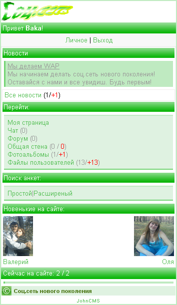 Ещё парочка скринов. На этот раз главную изменил, и создал кое что новенькое. Ниже выложу, что это описывать не буду;) А пока скрин главной,конечно же авторизованого пользователя.