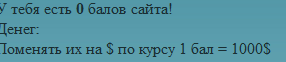 echo 'Поменять их на $ по курсу 1 бал = 1000$<br/>'; BEST_MASTER, Это пипец сайту, вертай всё файлы которые изменил