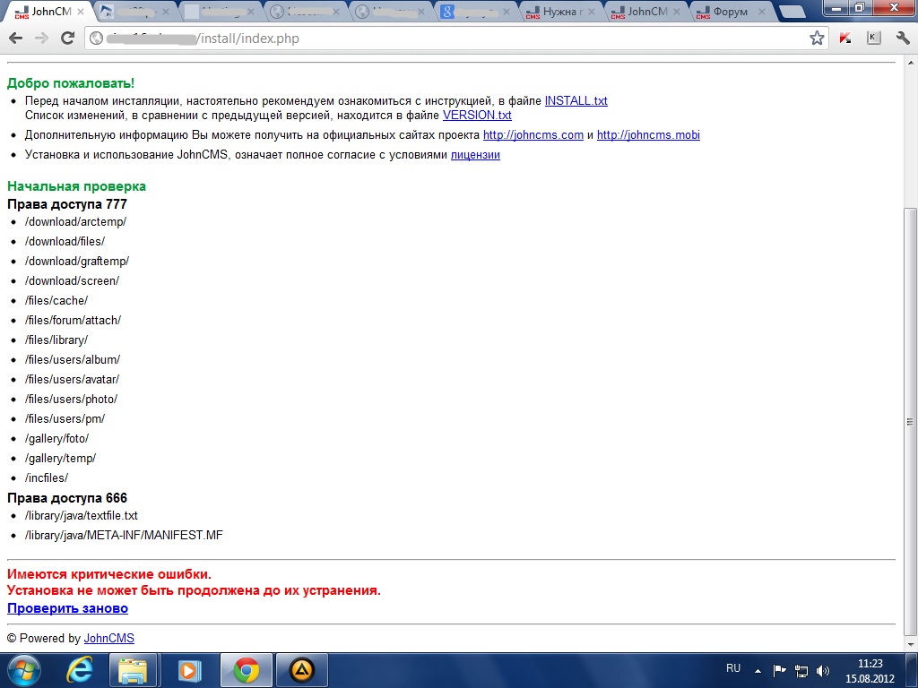 Всем привет. Я на хостинг залил JohnCMS, распаковал в public_html.Создал базу данных. Перехожу по ссылке мойсайт.ru/install.