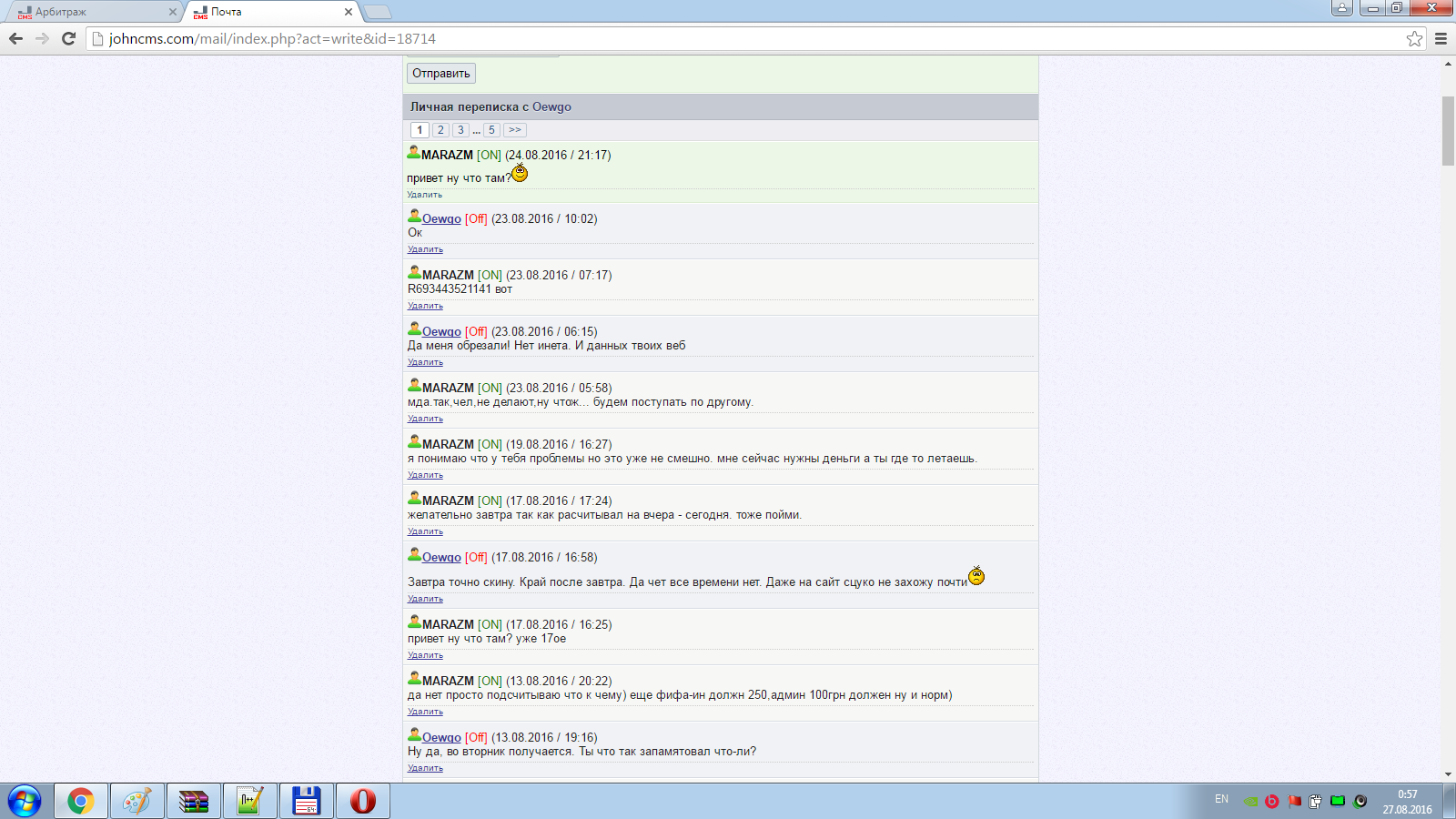 Некий Oewgo решил купить у меня раздел с сайта. С оговоренной ценой согласился, на свою голову так как имел с ним несколько удачных сделок решил дать рассрочку 200 сразу и 300 через неделю.Когда подошел срок попросил подождать а потом и вовсе пропал. После того как я написал на сайте его (Не знаю кому) девушке,подруге или жене, обьявился,мол отключили интернет а моего кошелька записанного у него нет. В этом же разговоре я дал ему номер кошелька он ответил ок и вновь исчез.