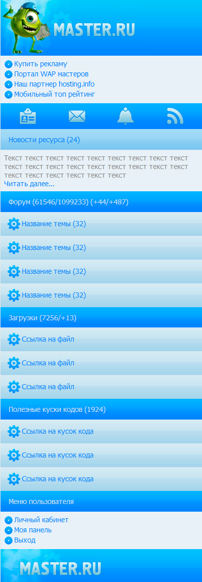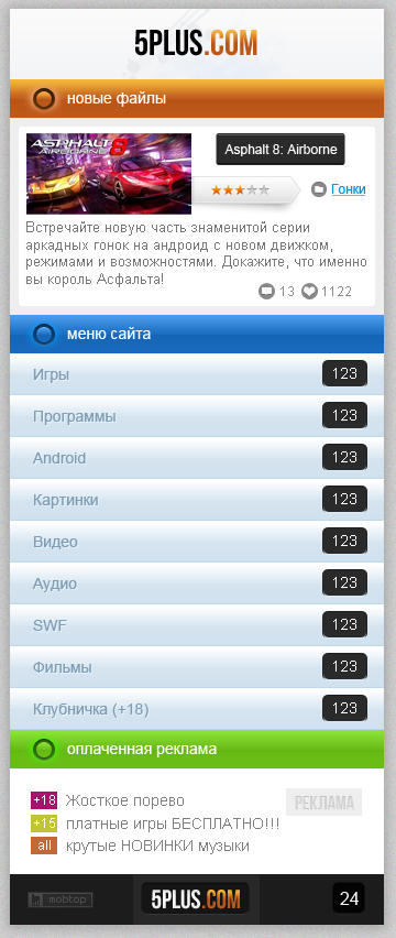 из последнего.. мобильная версия для сайта с загрузками, по эскизу заказчика upd: Больше примеров в аське 29705130, возьму заказ на веб дизайн, дорого, долго.