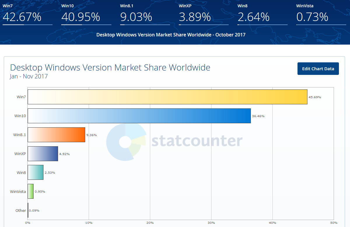 # intelligent (18.11.2017 / 17:33)Ну наверное не только у нас она на соплях держится. По статистике в мире сейчас десятка продаётся практически наравне с семёркой, но по прежнему семёрка лидирует по пользователям, с ощутимым отрывом. Это говорит о том, что многие не обновляются