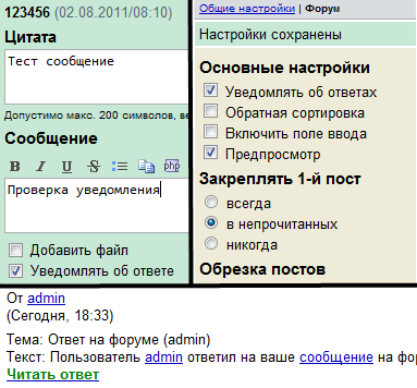 Уведомление об ответе на форуме с настройками (в приват)