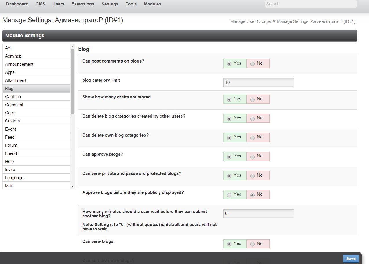 группа Администратор - выбор ее прав и ограничений