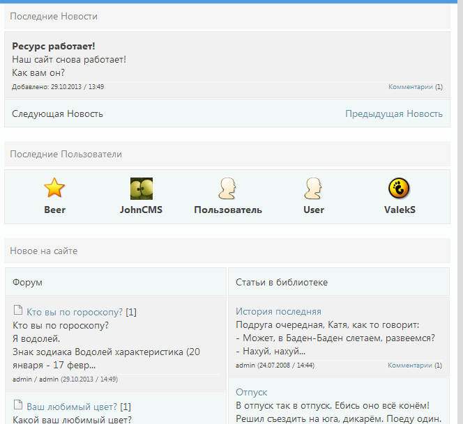 На скрине ниже вывод тем форума, статей библиотеки. Это можно и сейчас на сайте выше увидеть. Исчо есть вывод последних пользователей(не помню было это изначально в теме или нет). И так сказать эксклюзивный вывод Новостей. Который в тему включён небыл. Может выложить надать или что...