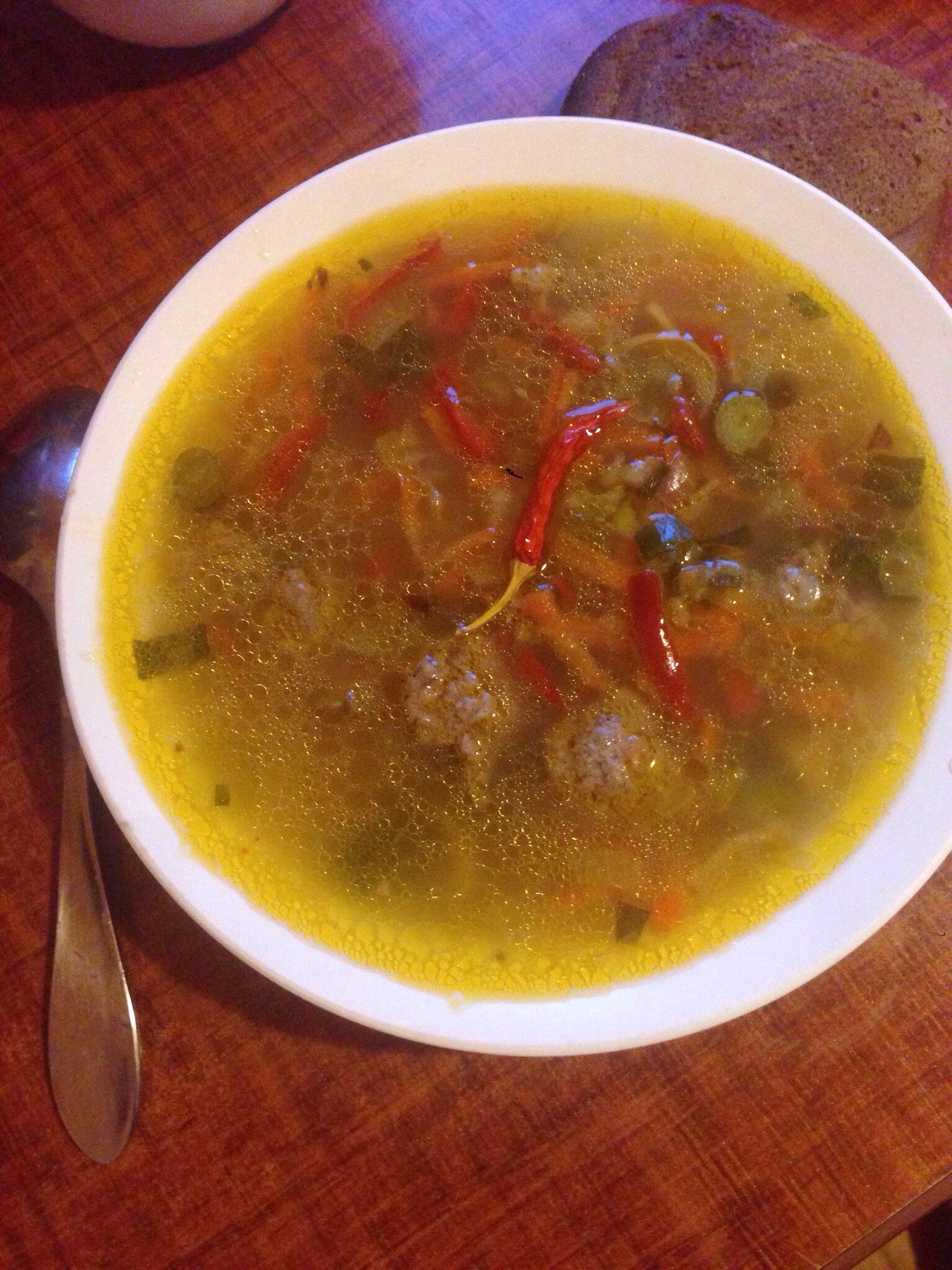 Суп с рисом, болгарским перцем, шампиньонами и фрикадельками )