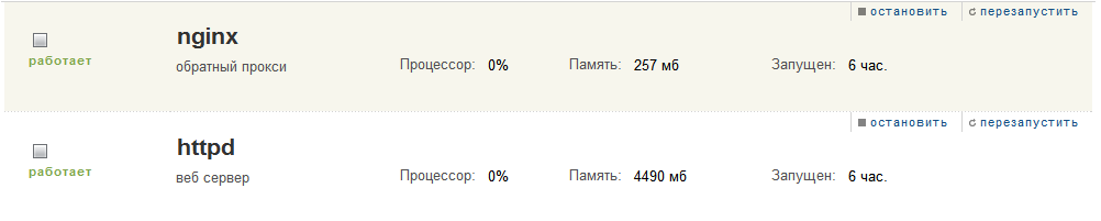 # venom (07.08.2013 / 16:43)Сейчас включены: nginx, apache, ftp, cron + панель vesta