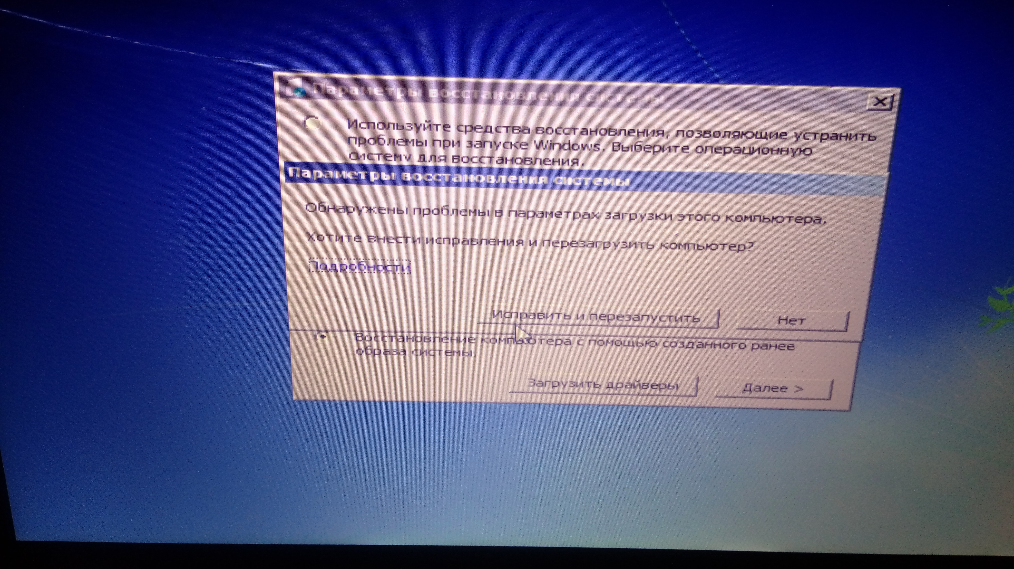 Всем привет. После отключения электричества, я не успел нормально выключить комп. У меня стоит защита (от перепада электичества или от резкого его выключения) и на пол дороги нормального выключения компа, заряд защиты кочился и он резко вырубился. Теперь постоянно выдаёт такую ошибку (картинка). Чё делать?