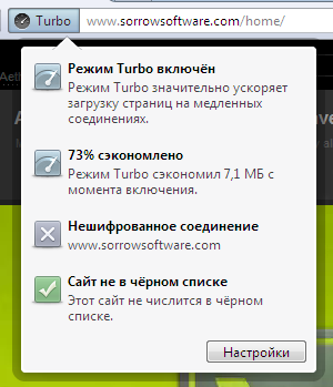 Теперь — о скорости. Понятно, что браузер стал работать ещё быстрее. Это можно даже не указывать в пресс-релизах. Но в Opera есть уникальная функция, имеющая прямое отношение к скорости — Opera Turbo. И над ней также была проведена большая работа. Изменения опять же в основном внутренние, вроде улучшения алгоритма сжатия картинок, позволяющего отображать более качественные изображения, но есть и внешние добавки — в виде специального меню, открывающегося при клике на индикаторе.
