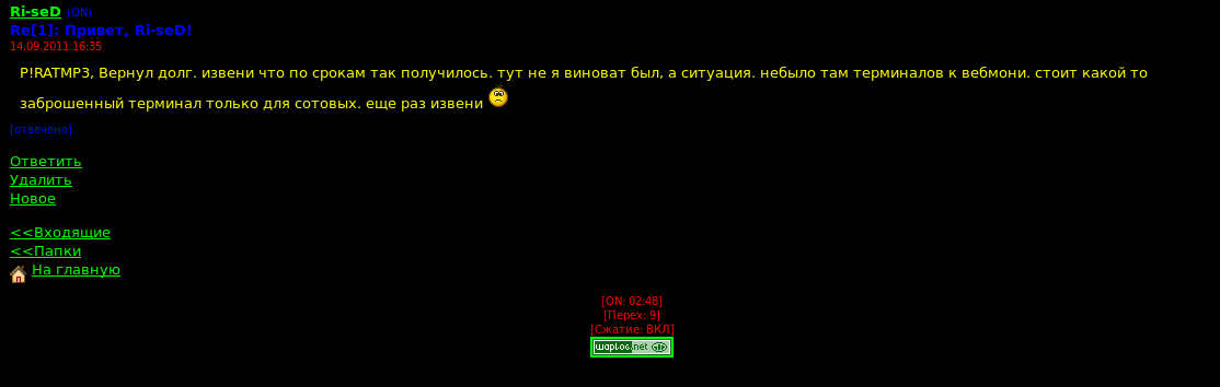 FlySelf, странная логика у тебя. он между прочим твоими платными модулями барыжал! и подводил не только тебя но и людей которые тебе деньги платили! а потом вообще в пабл выложил всех их. для меня если человек один раз киданул, значит еще раз киданет, не важно седня или завтра или через месяц! факт то что кто был кидалой, тот им и останется! а доказывать тебе или кому то я не чего тут не собираюсь! это безтолку! вам доказали что за тем человеком были не однократные факты кидалова, вы забили, еще раз докажу так же забьете, мне что заняться больше не чем чем страться найти какую то правду у людей которые ее не хотят слышать...