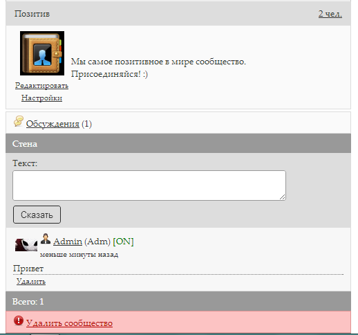 - Возможность удаления сообщества