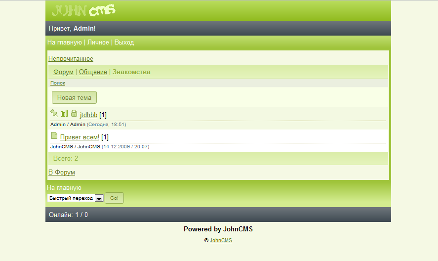 Ну собственно вот темка Greendays для JohnCMS 4.х.х(на 3.х.х тоже станет). Тема имеет приятный внешний вид и выполнена в мягких светло-зелёных тонах(скриншоты далее), написал специально в паблик минут за 40. Гг