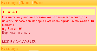 KanzaS (27.01.2011/15:29)Дело в том, что я еще обновление сделаю, чтоб администратор мог пользователю в редакторе анкеты вписать монеты! И мне как то лучше было чтоб монеты были! Кто хочет может изменить в коде на баллы