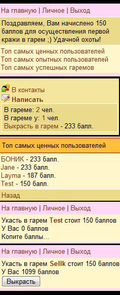 Каждый игрок может выкрасть в свой гарем другого игрока за баллы. Причем с каждой кражей пользователя его цена возрастает на 25% (становится более ценным). Для любителей свободы есть возможность выкупить себя из гаремов за баллы. Чем больше пользователей побывали у Вас в гареме и чем больше раз украли Вас, тем выше Вы в рейтингах игры .gif)