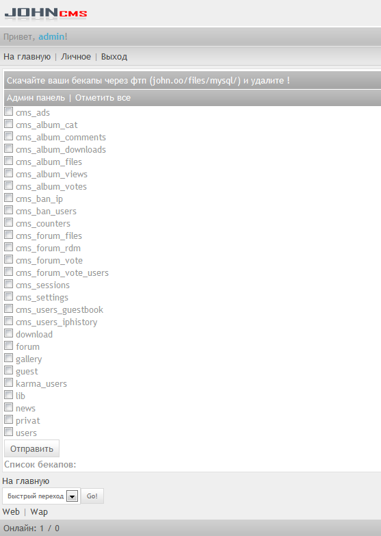 Создает backup выбранных или всех таблиц.