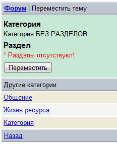 Учтите, что если вы в админ-панеле измените тип категории с "Темы" на "Разделы", когда в категории уже будут присутствовать темы, то после изменения типа категории эти темы будут не доступны(!). Для доступа к ним, их потребуется перенести в другие категории/разделы.