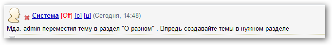 `text` = 'Мда. $login переместил тему в раздел \"$ra\" . Впредь создавайте темы в нужном разделе'