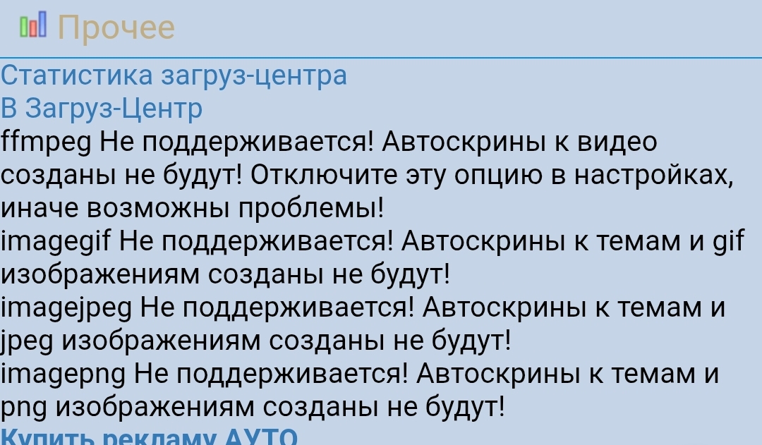 ffmpeg Не поддерживается! Автоскрины к видео созданы не будут! Отключите эту опцию в настройках, иначе возможны проблемы!imagegif Не поддерживается! Автоскрины к темам и gif изображениям созданы не будут!imagejpeg Не поддерживается! Автоскрины к темам и jpeg изображениям созданы не будут!imagepng Не поддерживается! Автоскрины к темам и png изображениям созданы не будут!