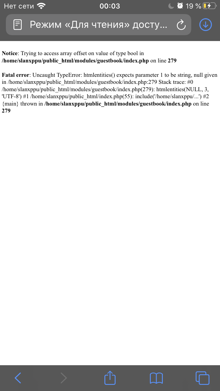 Simba, Движок только установил с нуля .В гостевой я написал сообщение , затем нажав на пост кнопку «Изменить» , и отображает данную ошибку.