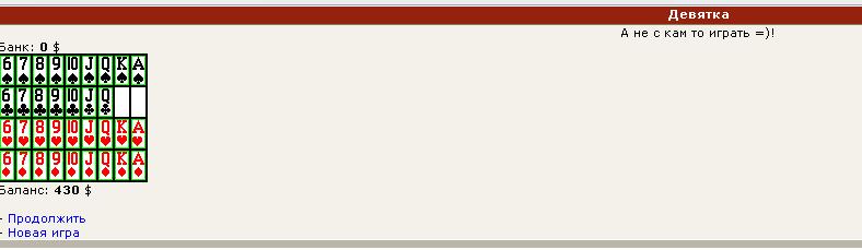 Предлагаю вашему вниманию игру «Девятка». Когда то у меня был диск с такой игрухой, не знаю кому как а мне нравилась =) Вот в свое время задался целью написать такую игрушку. Написал кстати давно, она есть в моем сервисе чатов, но там нужно регистрироваться. А вот сейчас просто добавил на сайт, кому не лень зацените. Правила немного переделал зачем уже не помню =) Самое интересное ни как не мог придумать ИИ для игры, самое интересное она играет и без него =) Собственно вот ссылка на игру. (Правила там же)