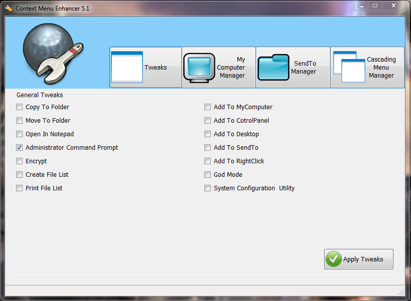 Ещё программка Context Menu Enhancer — это удобная утилита, которая предоставляет вам различные варианты контекстного меню. Просто установите нужный флажок и опция будет добавлена в контекстное меню правой кнопки мыши.