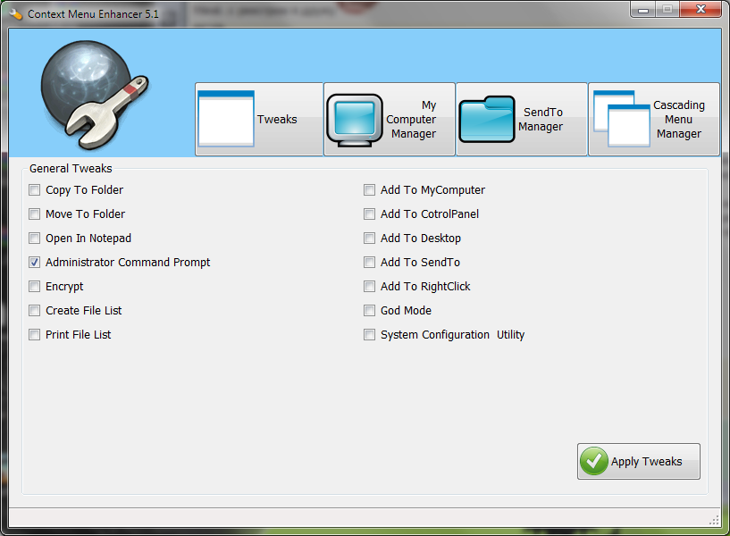 Context Menu Enhancer позволяет одной галочкой создавать в контекстном меню Проводника то, на что нужно потратить пол-часа, изучая всевозможные справочные материалы. Помимо часто используемых команд, программа умеет добавлять в контекстное меню любую папку, как в само меню, так и в раздел “Отправить”. Программа прекрасно работает в Windows XP, Vista и 7. Для того, чтобы изменения вступили в силу, нужно обладать правами администратора.