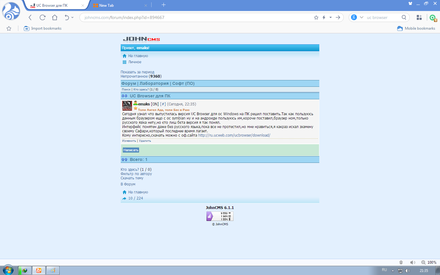 Сегодня узнал что выпустилась версия UC Browser для ос Windows на ПК решил поставить.Так как пользуюсь данным браузером ещо с ос symbian ну и на андроиде пользуюсь им,короче поставил,браузер ном,только русского язіка нету,но єто лиш бєта версия я так понял.