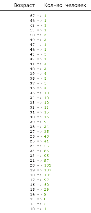 Было просканировано 22270 идентификаторов, из которых 1142 указали свой возраст, и еще - 5-10 человек которым по 200-300 лет или которые не успели родиться.