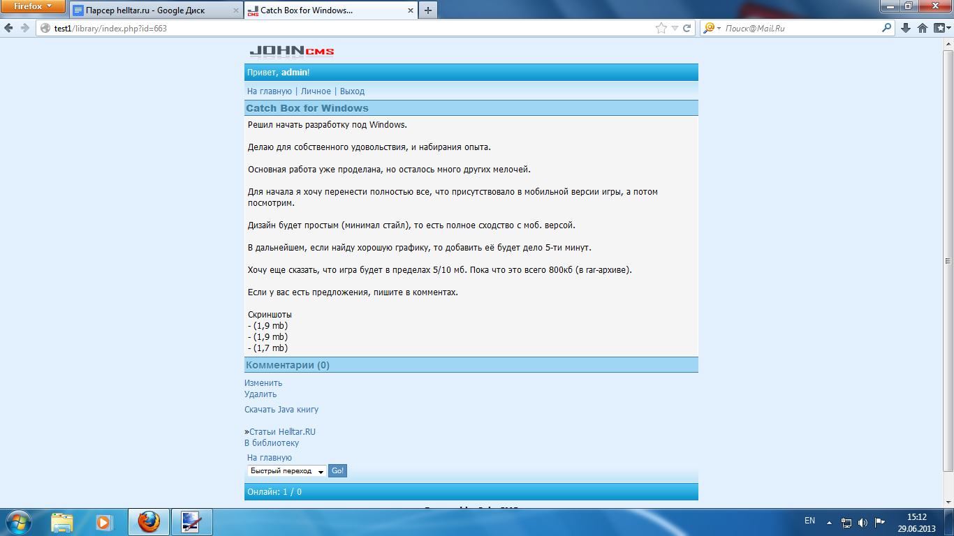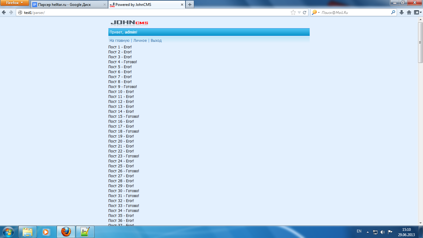 Итак, приступим! Я начну с того что создам в корне чистого JohnCMS папку parser. В ней я создам файл index.php, в кодировке UTF-8(без BOM), в котором напишу заготовку обычной странички для движка JohnCMS: