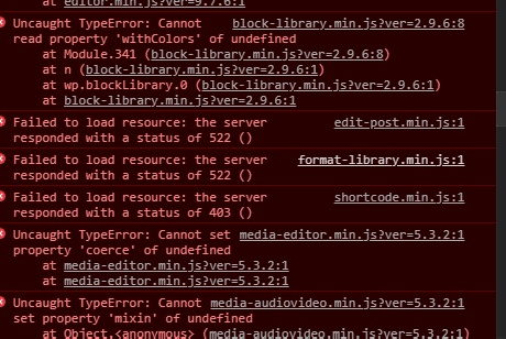 Работал мой сайт работ и тух куяк и перестал. Тупо не открывается визуальный редактор. Грешил на кешь. У меня связка WP Fastest Cache + cloudflare CDN. Очистил кеш и в плагине и на cloudflare. Не помогло, вырубил все плагины, переустановил, очистил кеш, не помогло. Включил debug true ошибка не воспроизводится. Кто шарит? Что это может быть за хрень? Все работает, кроме визуального редактора. Не возможно добавить статьи. Еще вот такая хрень (см скрины). Я х.з. что это и как теперь вернуть все. 3 дня ни чего не добавлял, а тут решил добавить пару статей и писец.