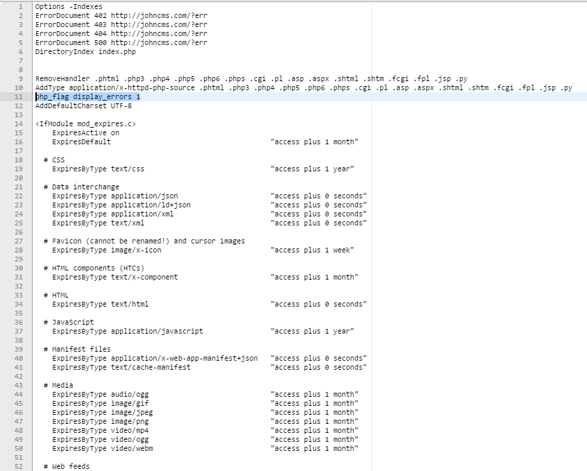 Раньше в .htaccesse Джона она была на 10 строке, а в более новых версиях эту директиву вообще почему-то убрали (не знаю почему) и как ты успел заметить да, ее действительно там нет.