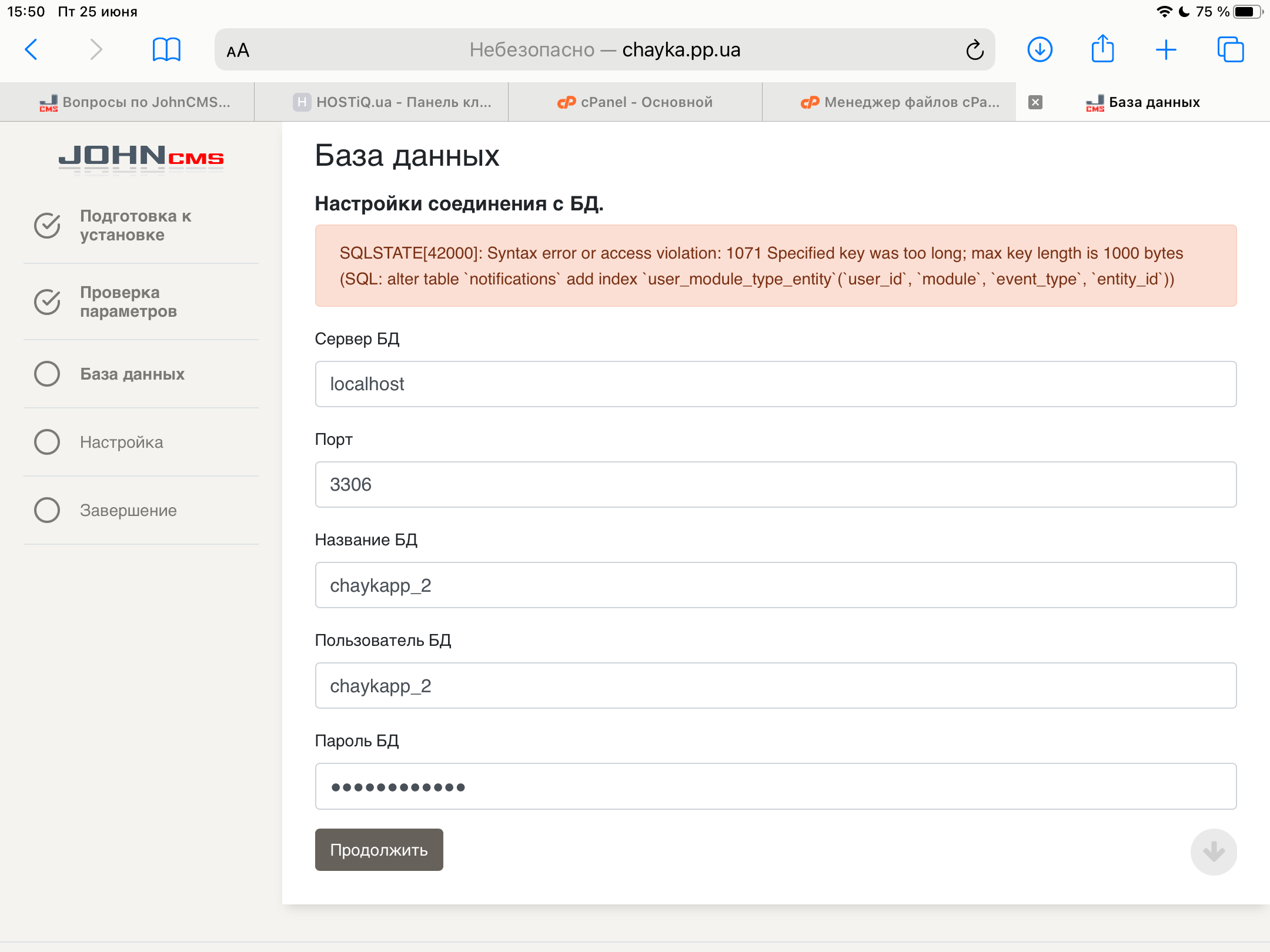 Мы проанализировали процесс установки выбранной Вами CMS и видим, что она создает таблицы в формате MyISAM, для которого согласно документации (https://dev.mysql.com/doc/refm ... .html) максимальная длина индекса составляет 1000 байт (другой размер ключа возможен только при кастомной сборке сервера из исходников, что невозможно в рамках услуги виртуального хостинга), но при этом пытается создать индекс размером 1071 байт. При этом инсталлятор упорно не создает таблицы в формате InnoDB, который позволяет работать с индексами подобного размера.