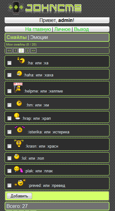 Значит так, тема с измененным mainmenu.php для JohnCMS версии 4.3. Это переделка дефолтовской темы, если где какие цвета не соответствуют теме в целом, простите. Так как основная задача была сделать именно главное меню удобным для сенсорных телефонов и изначально переделывать тему полностью не хотел. У кого из дизайнеров форума появится желание переделать или дополнить тему, буду только рад.