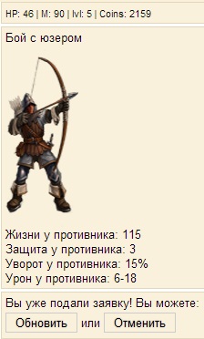 valik619 (20.02.2013 / 21:38)ещё сделай так, чтобы если заявка принята, то и подавшего заявку игрока тоже кидало на страницу боя, а то допустимя я вызвал, противник ответил через 20 минут, я уже забыл про заявку, а противник меня во всю дубасит. И сделай чтобы заявка была недействительна, если во время принятия падавший покинул сайт