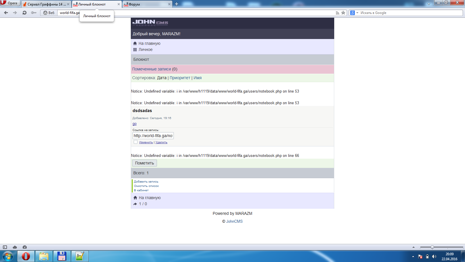 Unknown table 'johncms.notebook'. Переведи в гугле это сообщение.