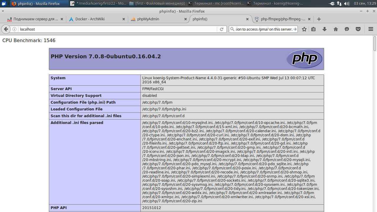 ->save(new FFMpeg\Format\Video\WebM(), '/srv/www/localhost/export-webm.webm'); Koenig, поправил бы твой гайд по установке php. Рискованно ставить 7.0 и потом танцевать с бубном над понижением версии, так тот же джон не заведется. Можно поставить PPA, который дает возможность использовать несколько версий пыха и по надобности включать необходимую версию.