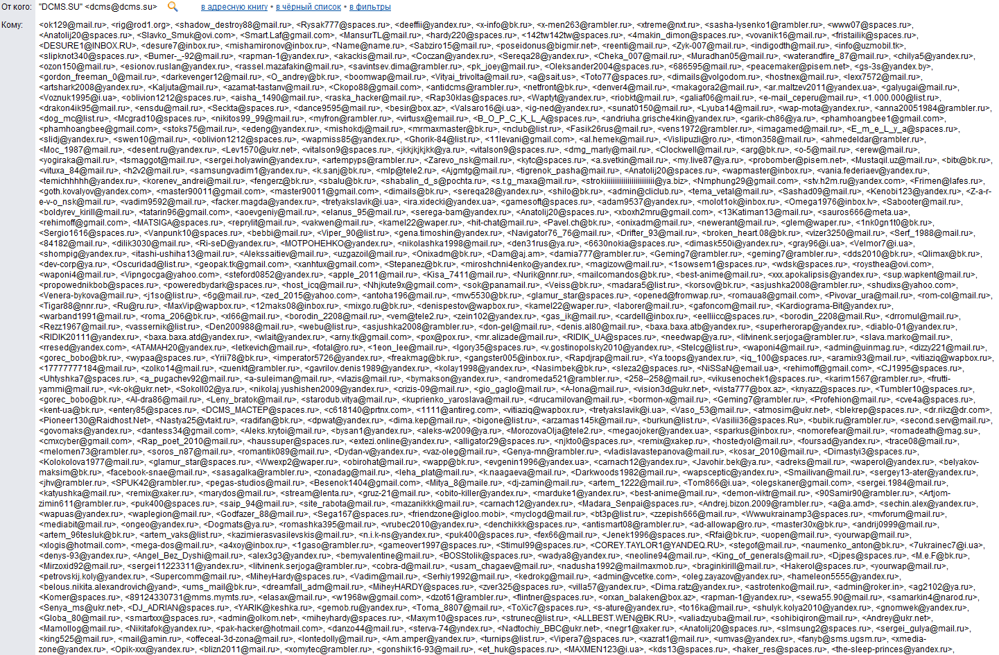 Минут 10 назад пришло письмо с сайта дцмс, что релиз новой версии задерживается ну и фиг с ним. Но в поле "кому" еще отправлено письмо было две, три сотни адресов почтовых ящиков. Так вот как это расценивать что админ дцмс в общем с ума сошел или просто тупо спамерам подарок делает?