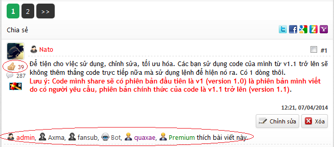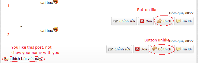 Today, i come here to show you guy a code that make users from your site can like post. Of course, they can unlike that post after they liked. When unliked, the button "Like" will appear again. In addition, the poster who received liked or unliked will received a "System Message" that alert the user who like post or unlike post and the link to post that liked or unliked (jumped to the post #). The list of the liker will apear on the bottom of the post and count total like received of user. This is an example. look picture.