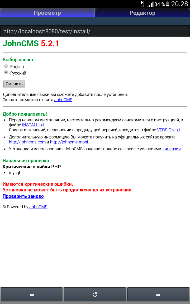 Кто сталкивался с этой проблемой? Установил на планшет phpruner(все работает) , на корне создал папку test и залил джон, перехржу по http://localhost:8080/test/install открывает установщик джона но внизу написана что есть проблема с mysql.