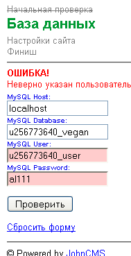 Неверно указан пользователь/ раньше же устанавливал на хостингере (бесплатн хост) и норм было. а сейчас такую фигню выдает.