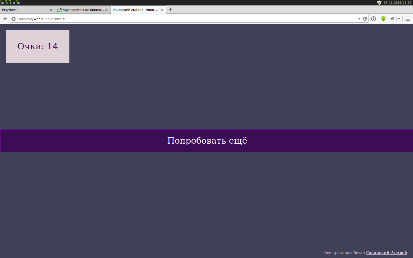 # Rakovskiy (30.10.2014 / 05:12) Моя первая мини игра на JQuery http://rakovskiy.wen.ru/hover.html