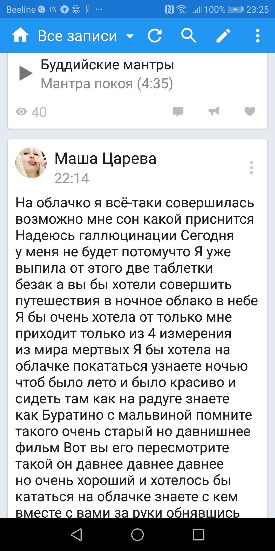 На улице прекрасная погода Я только что пришла встречалась с Никитой мы с ним были на дневном отделении психиатрической больнице получили то что никогда нельзя вылечить там и познакомились просто друг хороший человек