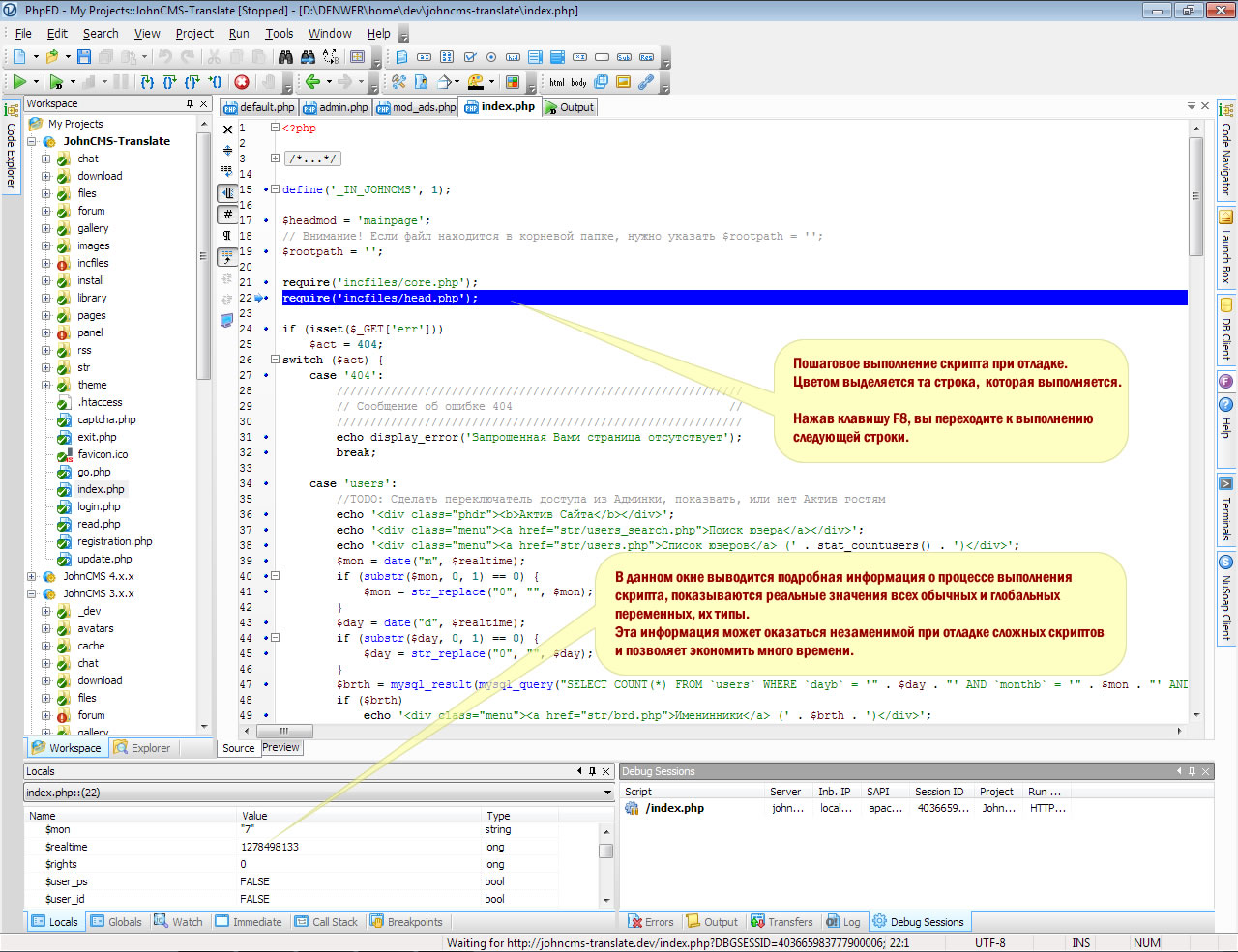Но существуют дополнения, которые устанавливаются на Ваш сервер отладки (обычно на денвер) и позволяют получать подробнейшую информацию о ходе выполнения скрипта.