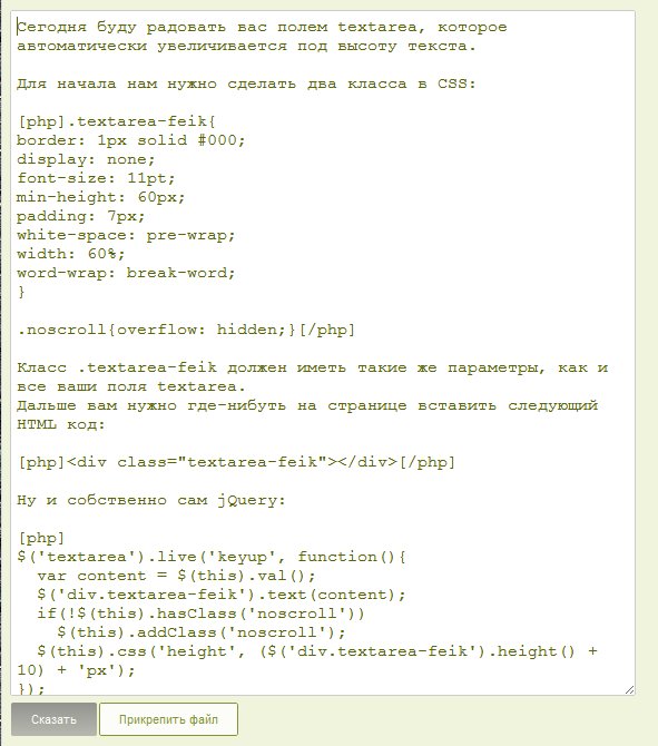 Сегодня буду радовать вас полем textarea, которое автоматически увеличивается под высоту текста.