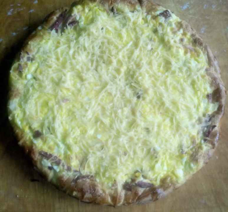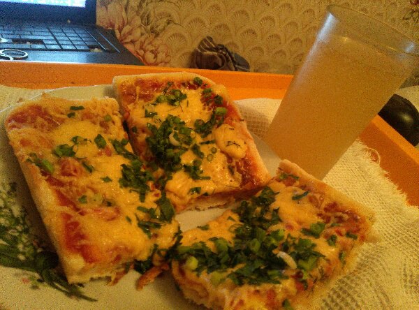 пицца (сосиски, сыр, соус томатный, яйцо, зелень) и квас по рецепту выше)