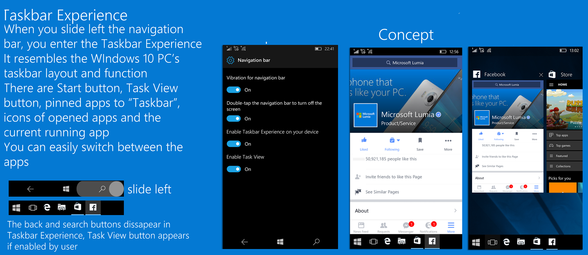 Интересный концепт панели задач в Windows 10 Mobile. При свайпе по ней влево появляестя список запущеных и закреплённых приложений, как в настольной Windows 10.