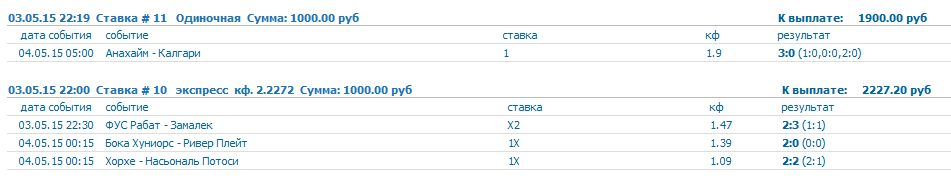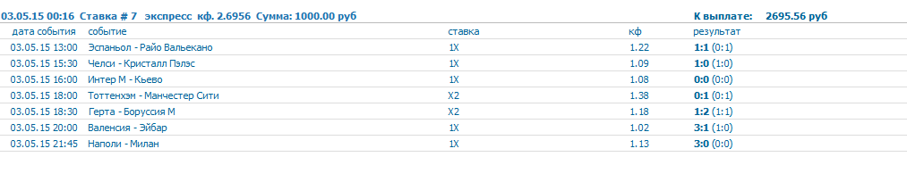 # gvozd (04.05.2015 / 08:36)Нормальные капперы не набивают кэф 2,6-3 набирая 6-7 событий. Они ставят твердве увереннве ставки с кэфом 4+